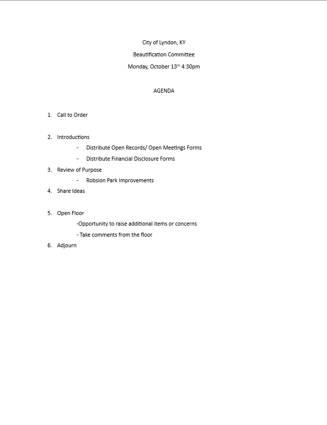 The Committee Serves to make recommendations to City Hall for improvements, renovations and maintenance of City parks and common areas.
